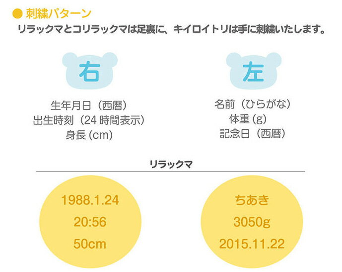 ■刺繍内容を注文ステップ3の備考欄に下記の内容を「コピー」「貼り付け」してご記入ください ●刺繍内容------------------------------- □おなまえ(ひらがな)【 】 □ぬいぐるみの重さ【 】g □足裏刺繍 <右足> (1)生年月日(西暦)【 】 (2)出生時刻(24時間表示) 【 】 (3)出生身長(cm)【 】cm <左足> (1)お名前(姓名の名/ひらがな)【 】 (2)出生体重(g)【 】g (3)記念日(西暦)【 】 ------------------------------- (C)San-X ■ご用途【誕生日】【お祝い】【お正月】【出産祝い】【結婚祝い】 【新築祝い】【開店祝い】【ひな祭り】【送別】【入学祝い】【卒業祝い】 【引越し祝い】【内祝い】【引き出物】【ブライダル】【プチギフト】【お年賀】【お歳暮】 【お中元】【子供の日】【母の日】【父の日】【敬老の日】【バレンタイン】 【ホワイトデー】【ハロウィン】【クリスマス】【二次会】【披露宴】 【結婚】【結婚記念日】【記念日】【アレンジ】【友人に贈る】【送料無料】【かわいい】 ギフト対応 沖縄は送料無料の対象外です/送料は見積です