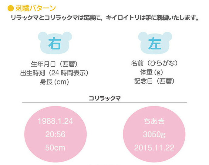 ■刺繍内容を注文ステップ3の備考欄に下記の内容を「コピー」「貼り付け」してご記入ください ●刺繍内容------------------------------- □おなまえ(ひらがな)【 】 □ぬいぐるみの重さ【 】g □足裏刺繍 <右足> (1)生年月日(西暦)【 】 (2)出生時刻(24時間表示) 【 】 (3)出生身長(cm)【 】cm <左足> (1)お名前(姓名の名/ひらがな)【 】 (2)出生体重(g)【 】g (3)記念日(西暦)【 】 ------------------------------- (C)San-X ■ご用途【誕生日】【お祝い】【お正月】【出産祝い】【結婚祝い】 【新築祝い】【開店祝い】【ひな祭り】【送別】【入学祝い】【卒業祝い】 【引越し祝い】【内祝い】【引き出物】【ブライダル】【プチギフト】【お年賀】【お歳暮】 【お中元】【子供の日】【母の日】【父の日】【敬老の日】【バレンタイン】 【ホワイトデー】【ハロウィン】【クリスマス】【二次会】【披露宴】 【結婚】【結婚記念日】【記念日】【アレンジ】【友人に贈る】【送料無料】【かわいい】 ギフト対応 沖縄は送料無料の対象外です/送料は見積です